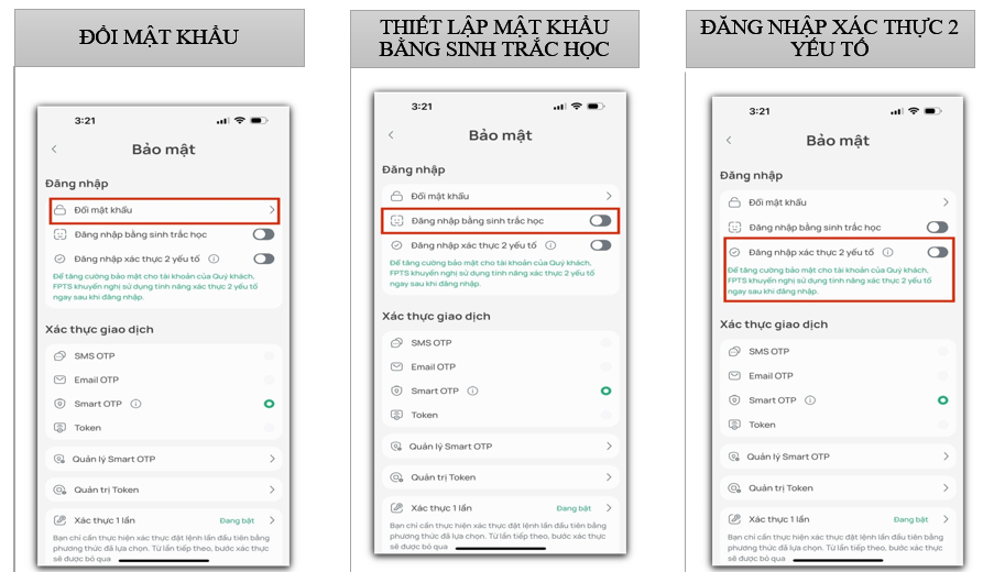 (*):Tùy chọn bật/tắt Xác thực một lần chỉ áp dụng cho phương thức xác thực Smart OTP và Token: