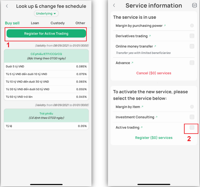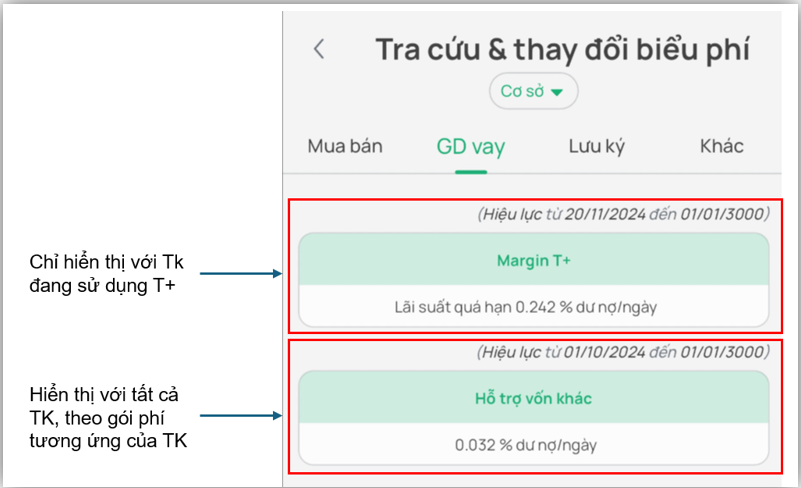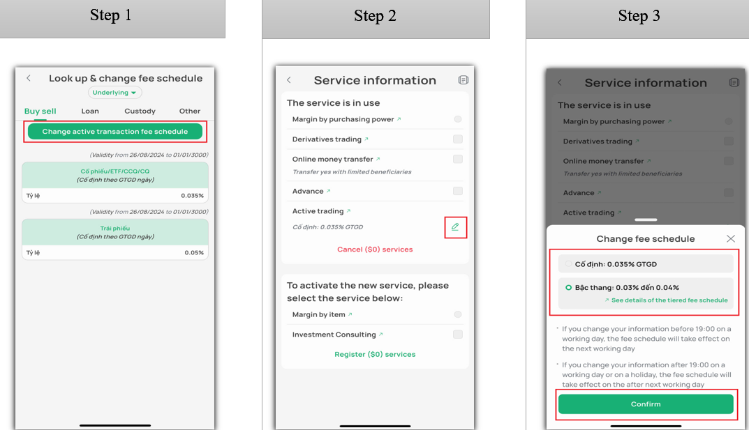 - Including the effective transaction fee and the Change fee schedule/Register active transaction section corresponding to each type of account.