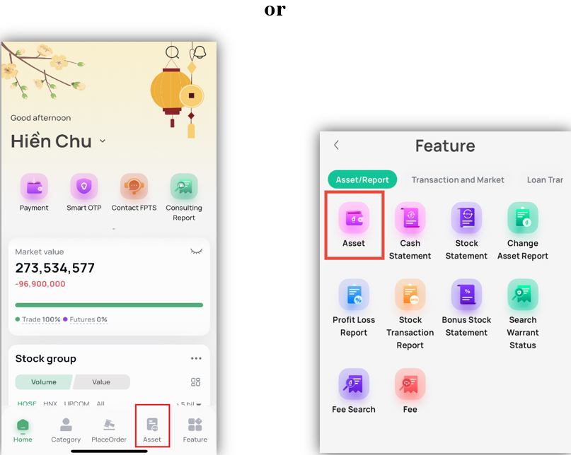 Please go to the Function section, click “View all”, select Asset/Report, then choose Stock Statement/Cash Statement.
