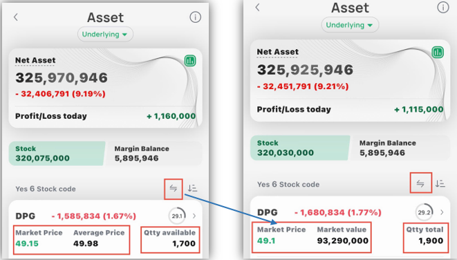 Add change feature to convert the displayed information: Default with old information: Market price, Cost price, Available volume. When clicked, it will change Cost price to Market value, Available volume to Total volume.