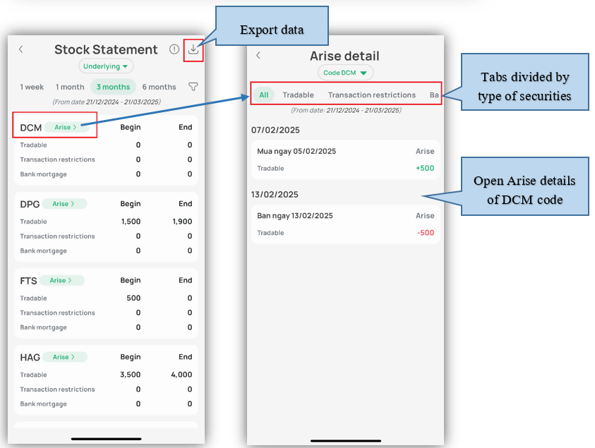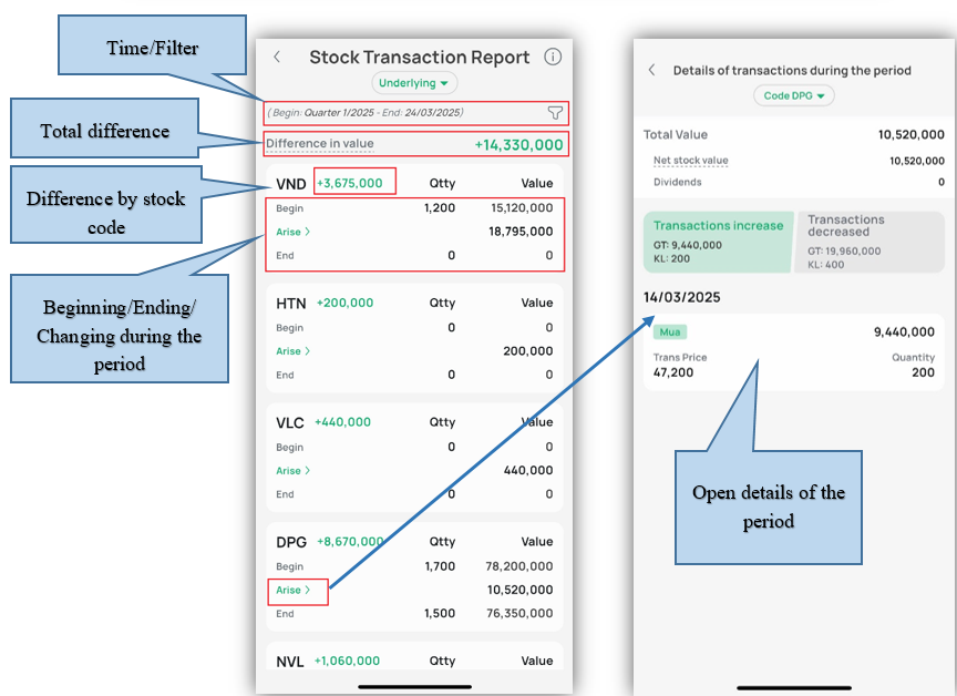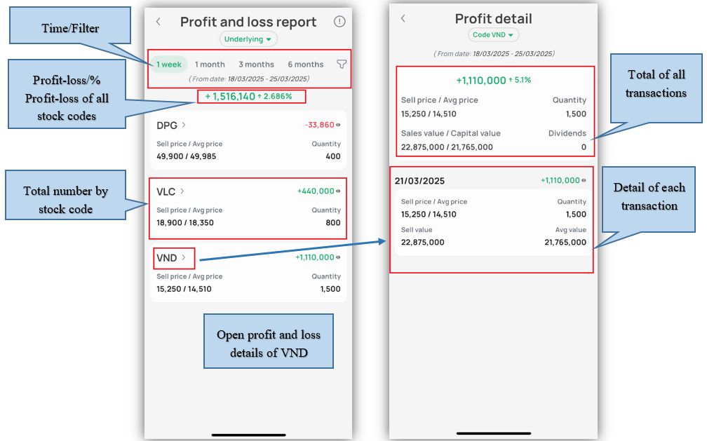 - Method 1: On the Profit/Loss Report screen, click on the Contract code on the day you want to view the details, the Details screen will appear including: Number of Buy/Sell at the beginning of the day, during the day, at the end of the day and price at each corresponding time.