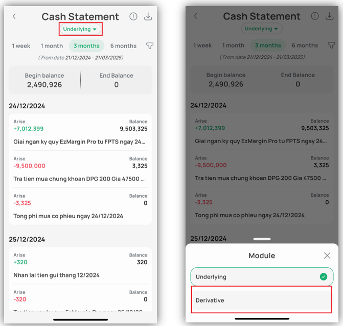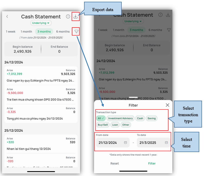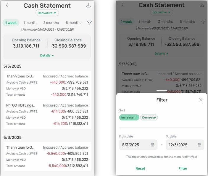 You can choose to view account statements by 1 week/1 month/3 months/6 months or select a custom time range and records can be sorted by time at the button
