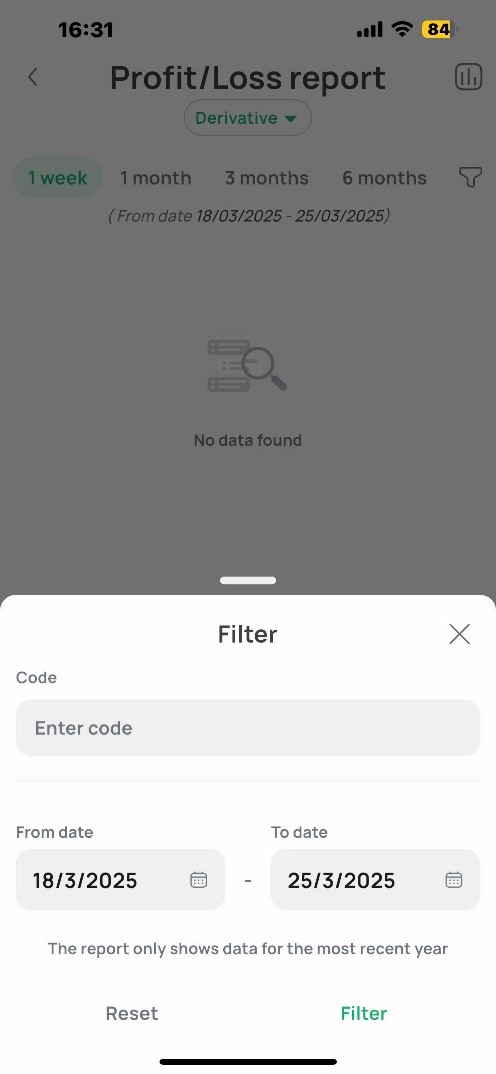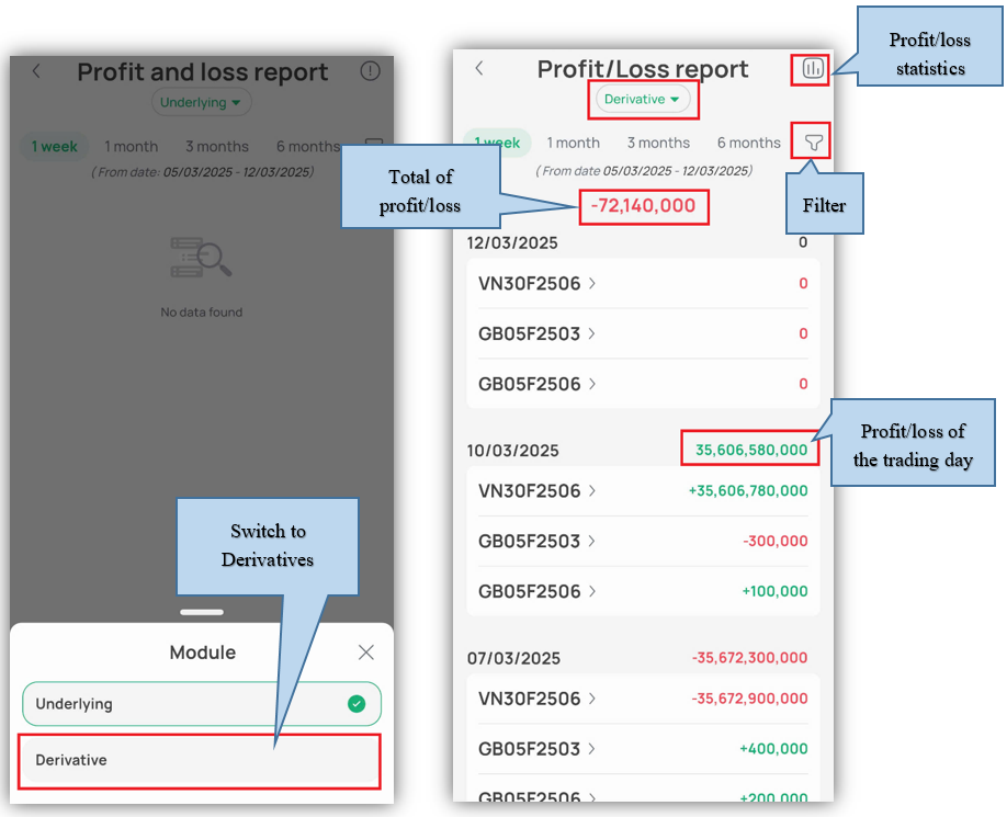 From the Function screen => Select Realized profit and loss => Select the Derivative subsystem, the report screen will be as follows: