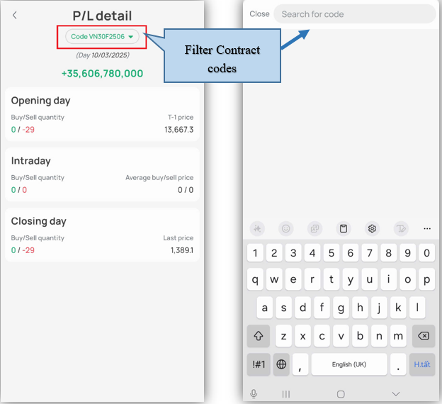 To view the details of the Profit/Loss of each contract code, you can choose two ways: