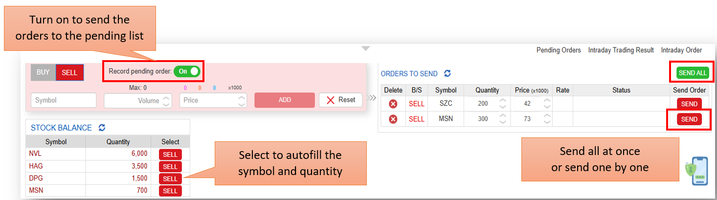 - Sell order: You must have sufficient securities balance to place an order: Order quantity <= Maximum quantity that can be placed