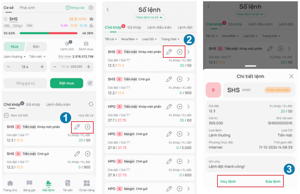 - Hủy/Sửa lệnh chờ khớp: Có thể thao tác Hủy/sửa từ 1 trong các màn hình sau