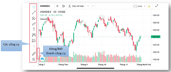 Trên thanh công cụ nằm ngang có các công cụ giúp cho Khách hàng lựa chọn các mã chứng khoán cần theo dõi, các loại nến, chỉ báo, lưu mẫu đồ thị, …